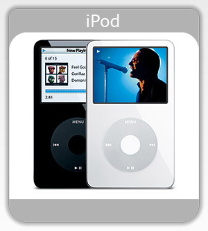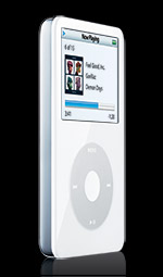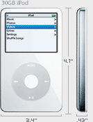 First, iPod put music in your pocket. Now it puts on a show. With support for up to 15,000 songs and up to 150 hours of video on a 2.5-inch QVGA color display, iPod gives you the ultimate music experience sight and sound in a lighter, thinner design. Available in classic white and dramatic black. |